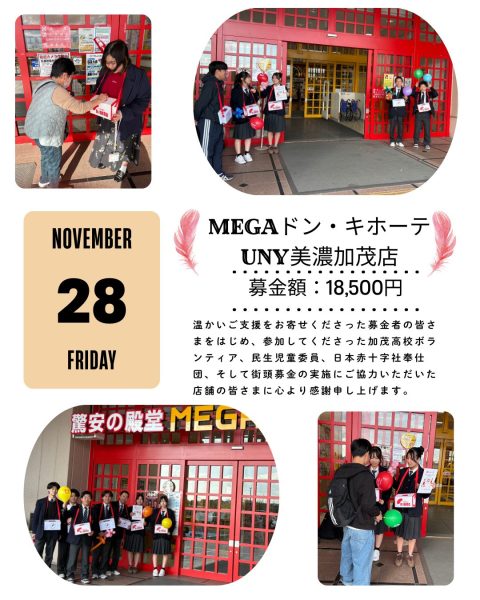 この活動には、市内中学生ボランティア・加茂高校ボランティア・ボーイスカウト美濃加茂第1団・中部国際医療学院ボランティア・赤十字奉仕団・民生児童委員の皆さんが参加し、下記の協力店舗の一角をお借りして地域の皆さまへ募金の呼びかけを行いました。