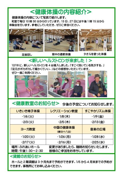 福祉会館だより1月号を発行します 2025.12.26 いつも福祉会館をご利用いただきありがとうございます。 会館の行事を掲載した「福祉会館だより1月号」を作成しました。 福祉会館をはじめ、図書館・文化の森・かも~る・各連絡所にも設置しております。 ぜひお手に取ってご覧ください。