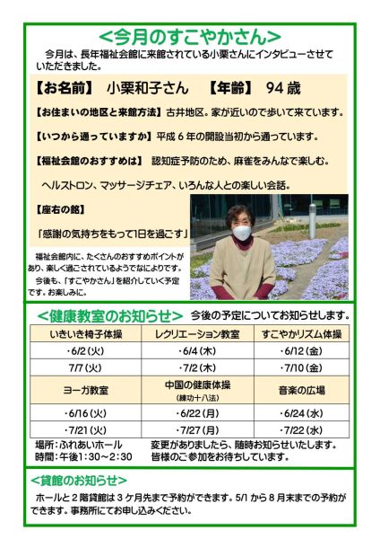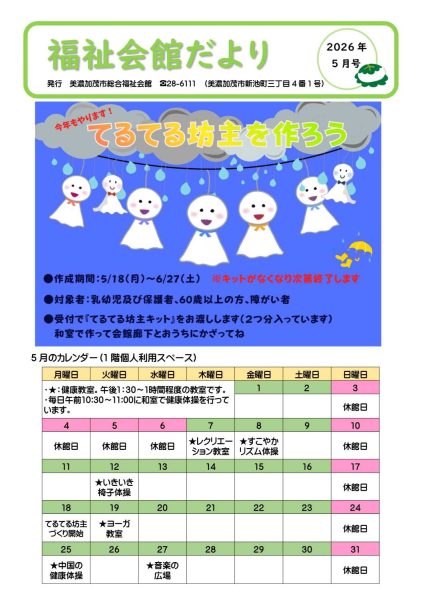 福祉会館だより5月号を発行します 2026.04.23 いつも福祉会館をご利用いただきありがとうございます。 会館の行事を掲載した「福祉会館だより5月号」を作成しました。 福祉会館をはじめ、図書館・文化の森・かも~る・各連絡所にも設置しております。 ぜひお手に取ってご覧ください。